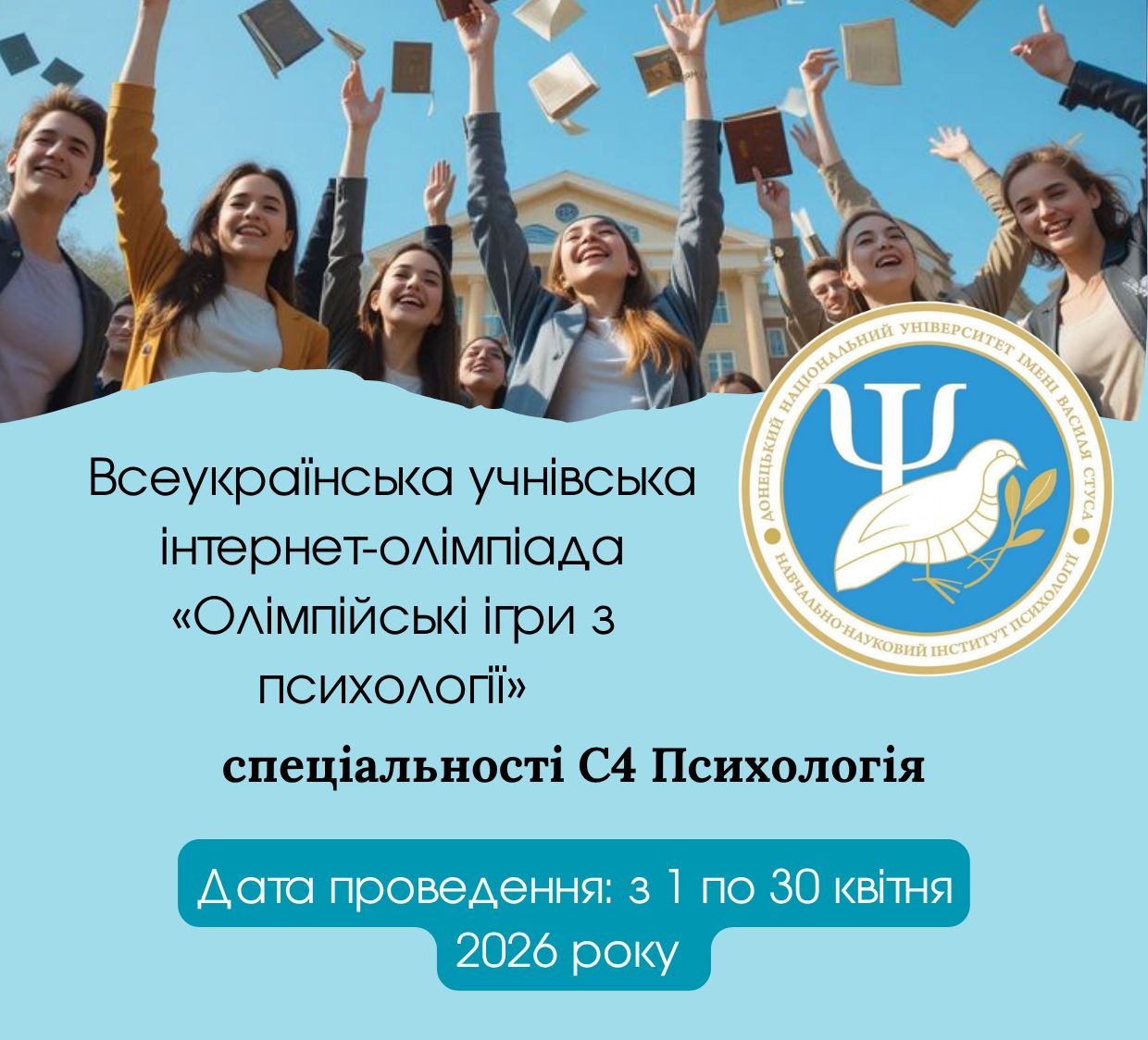 Всеукраїнська учнівська інтернет-олімпіада «Олімпійські ігри з психології» спеціальності С4 Психологія, яка проводиться з 01.квітня по 30 квітня 2026 року.