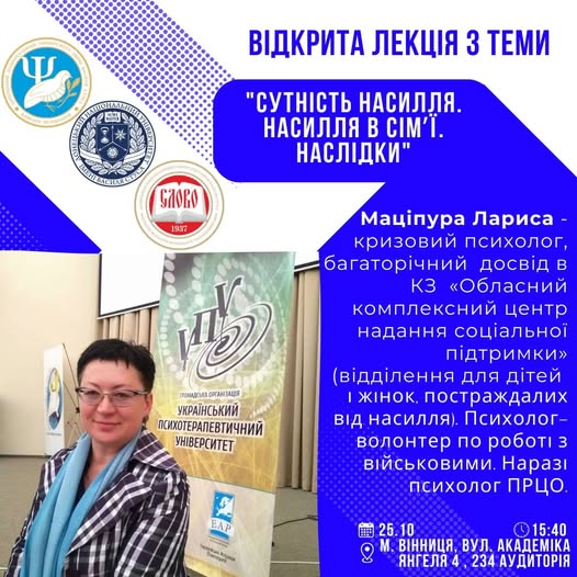 Шановні здобувачі! 25 жовтня 2023 року о 15:40 за адресою Академіка Янгеля 4, 234 ауд. та в онлайн режимі за лінком https://teams.microsoft.com/…/19%3aa…/conversations… відбудеться гостьова лекція на тему “Сутність насилля. Насилля в сім’ї. Наслідки”. Лектор – Маціпура Лариса – кризовий психолог, багаторічний досвід в КЗ «Обласний комплексний центр надання соціальної підтримки» (відділення для дітей і жінок, постраждалих від насилля). Психолог-волонтер по роботі з військовими. Наразі психолог ПРЦО.