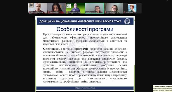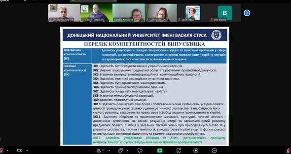 13 грудня 2023 року на кафедрі психології у онлайн режимі відбулось громадське обговорення ОНП “Психологія” третього (освітньо-наукового) рівня для здобуття освітньо-наукового ступеня Доктор філософії із зовнішніми стейкголдерами. В обговоренні взяли участь:
